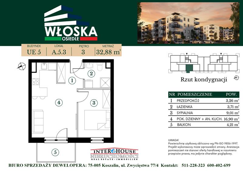 Oferujemy do sprzedaży 2-pokojowe mieszkanie o powierzchni 32,88 m2, z balkonem (4,21 m2). Typ mieszkania: "A5.3", środkowe, położone na III piętrze w klatce z windą. Zachodnia wystawa okien.