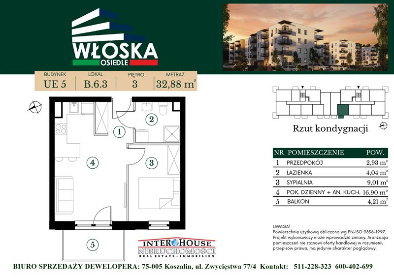 Oferujemy do sprzedaży 2-pokojowe mieszkanie o powierzchni 32,88 m2 z balkonem (4,21 m2). Typ mieszkania: "B6.3", środkowe, położone na III piętrze w klatce z windą. Zachodnia wystawa okien.