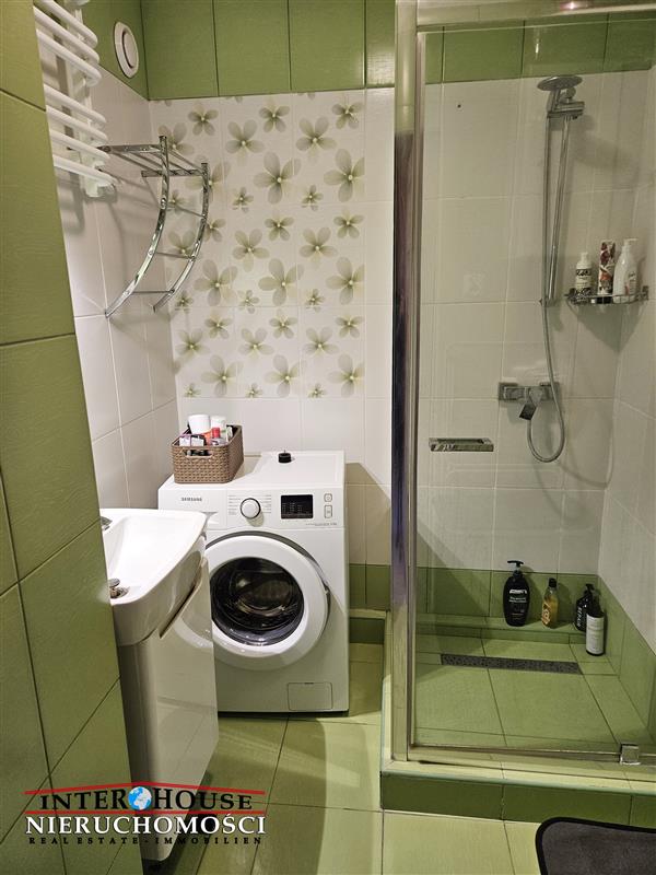 - łazienka: kabina prysznicowa, pralka, umywalka z szafką łazienkową, lustro