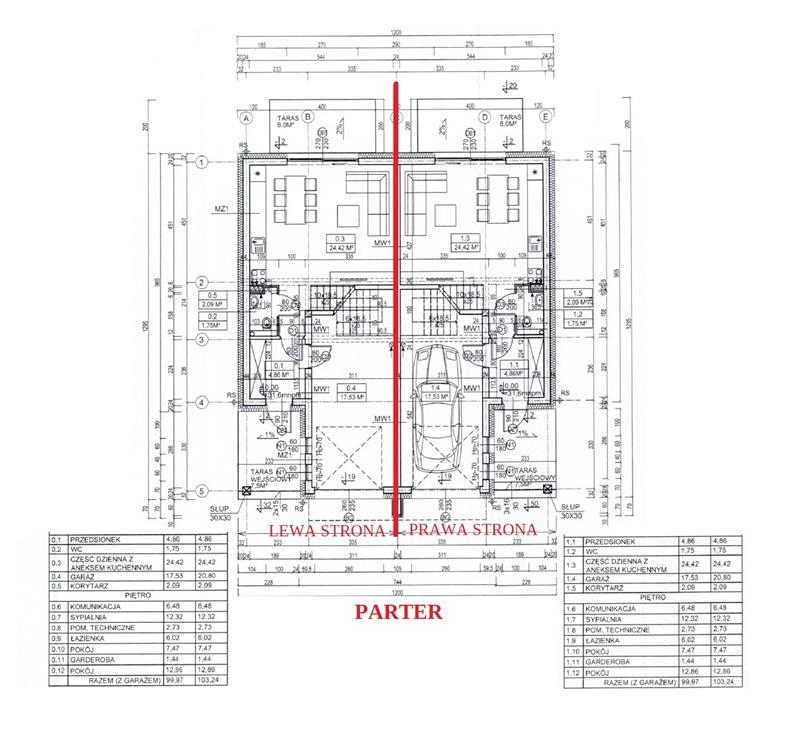 garaż z wejściem z domu – 17,53 m2 (0.4) + schowek 3,27 m2 (po podłodze)