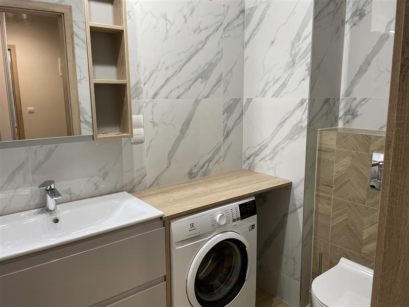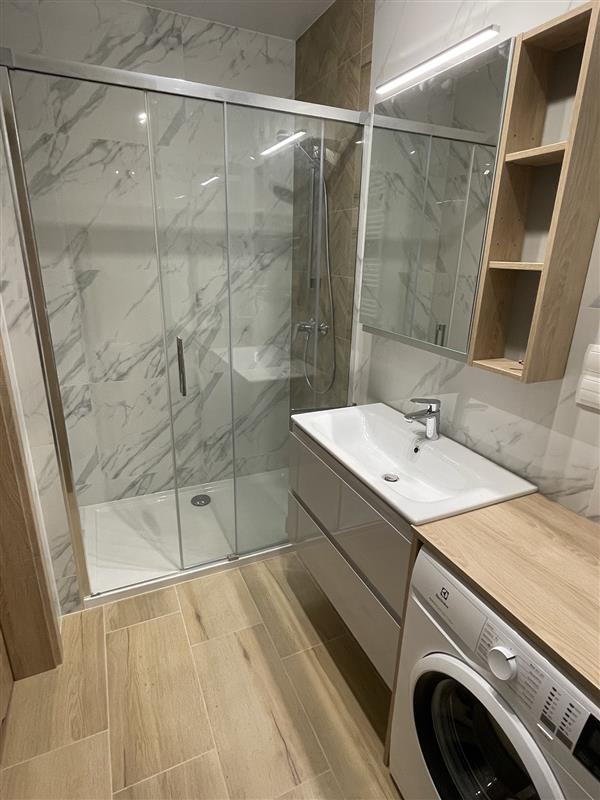 Łazienka: duża kabina prysznicowa, umywalka z szafką łazienkową z szufladami, szafka łazienkowa z lustrem, pralka, podwieszane wc